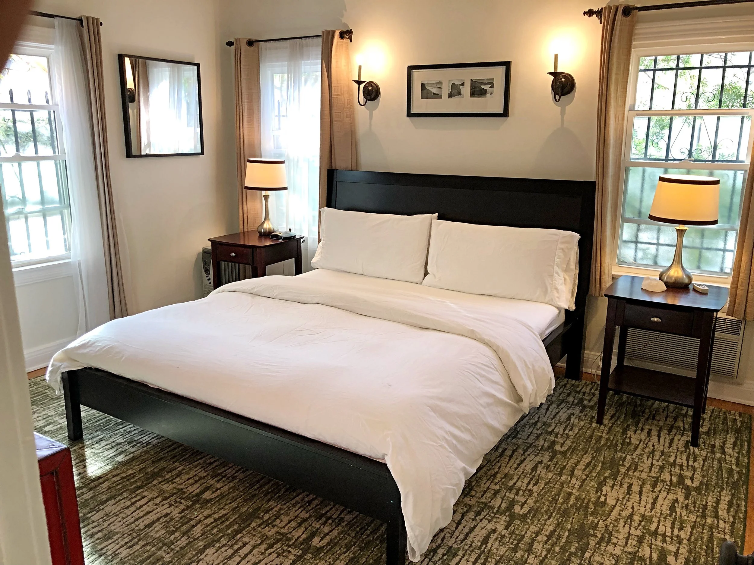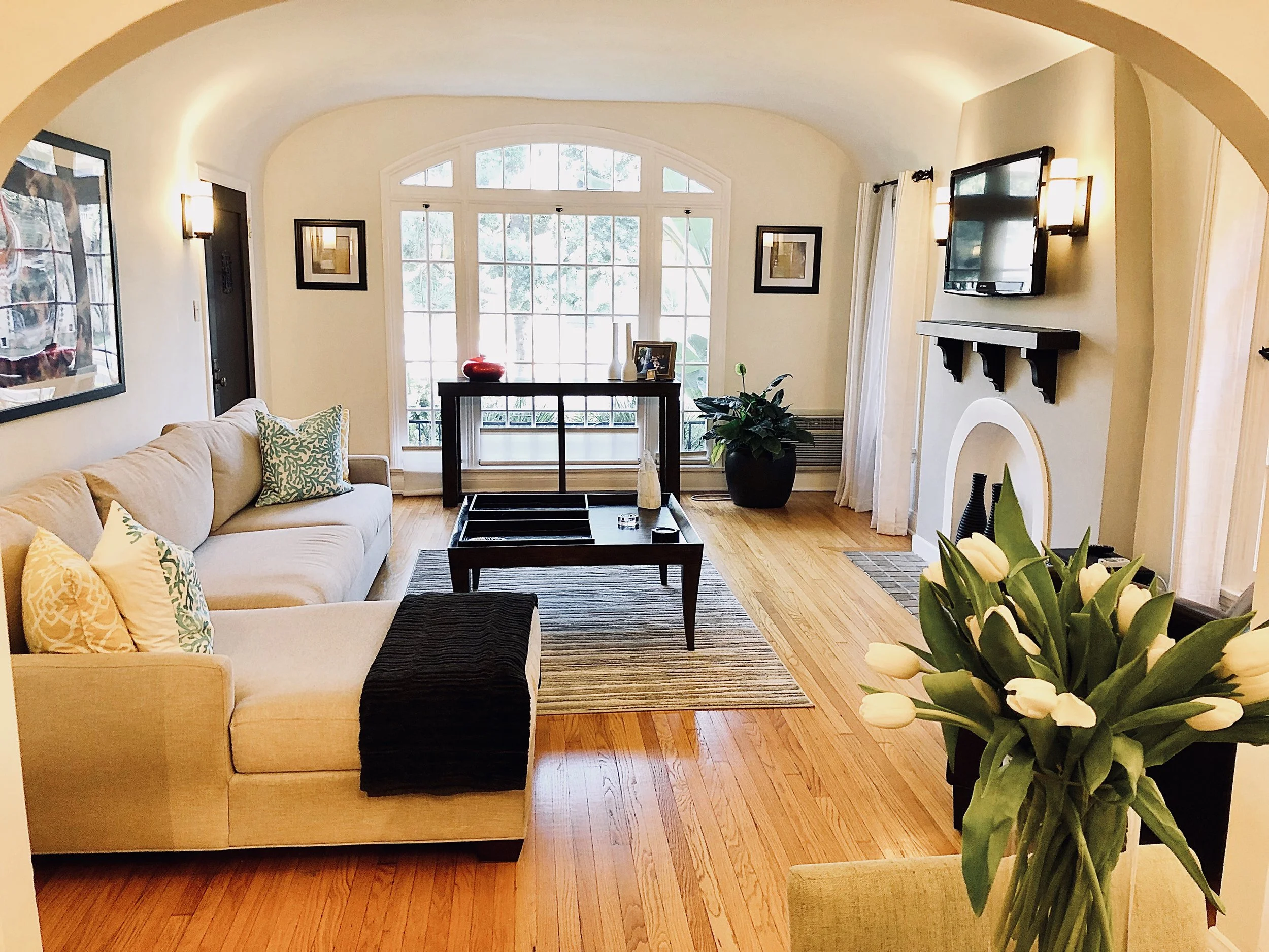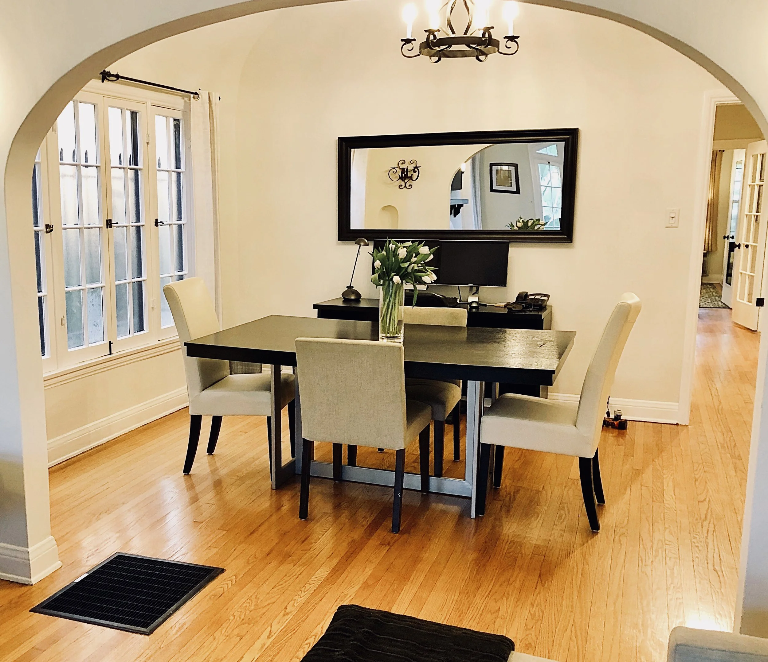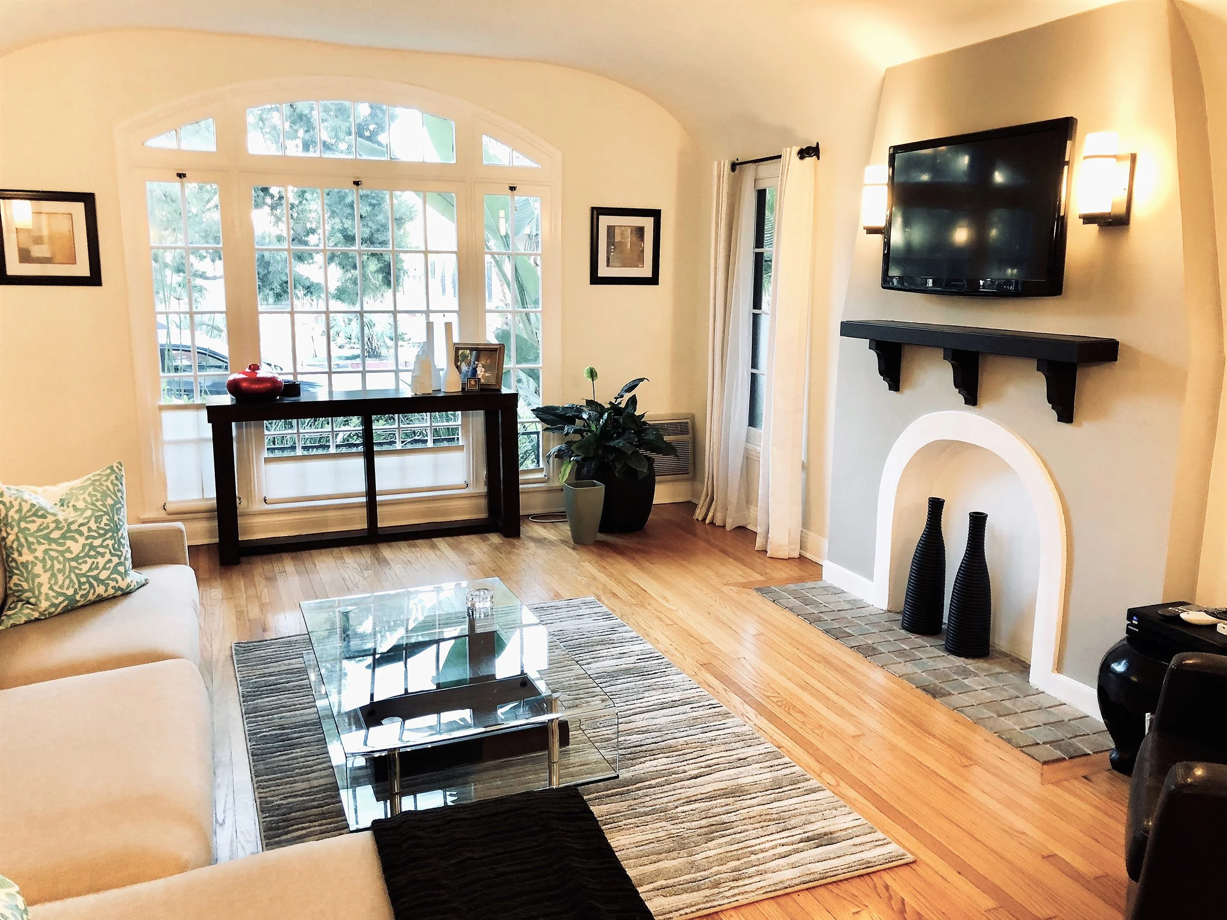 With high vaulted ceilings, hardwood floors, private front & rear entrances, off street parking and comfy furnishings this is a great home for an extended work trip.